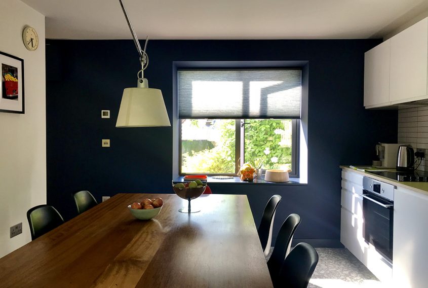 New materials and layout introduce a sense of calm and clarity whilst looking to retain an agricultural feel by using rough sawn oak floor boards. A bold and striking deep blue coloured wall work with the black cast iron woodstove and slate hearth to create a strong, purposeful character that also connects the living space to the kitchen/dining room giving a sense of continuity and interest. Roof beams uncovered in the roof space when opening the ceiling were sandblasted and oiled to give a sense of place as well as character.