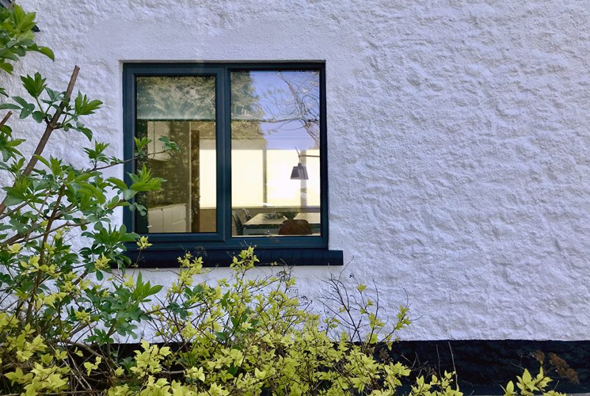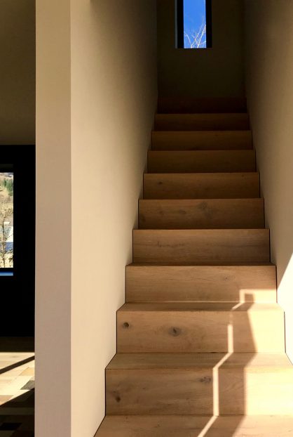 The new openings on the exterior façade look to both sharpen the visual expression with anodised aluminium frames as well as express the agricultural heritage of the annexe/barn. Reclaimed local marble kerb-stones are used at the main entrance to adjust to the new unified ground floor level and further link the renovation to its locality.