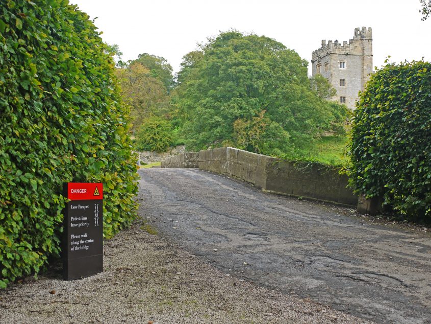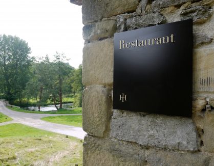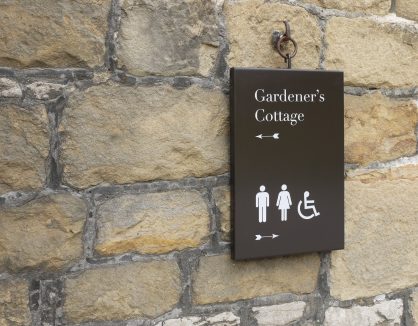 Laser-cut leatherwork brings traditional techniques a sharpness and contemporary feel but the materials and colour helps root the elements in place. Bronze was chosen outdoor signs and although a material/colour familiar to the middle ages, it does not exist at Haddon. This allowed the signs to be sympathetic to its context and at the same time stand out subtly.