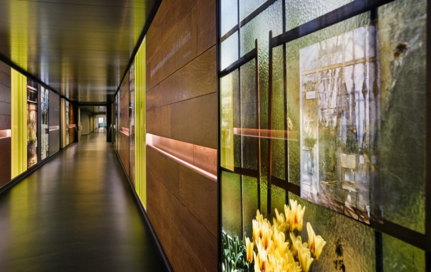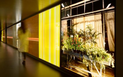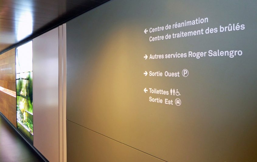 The project transforms a dark 100-metre-long corridor which symbolically connects an old and new wing of the hospital. It is an installation with art works by Jyll Bradley that gave a functional corridor a sense of space. Although the foreground is very much the artwork, essential elements such as handrails, signage, information display have been integrated into this installation. The artwork evolved through the engagement with the botanical gardeners of Lille and research into the city’s largely unrecognised history of botanical medicine.